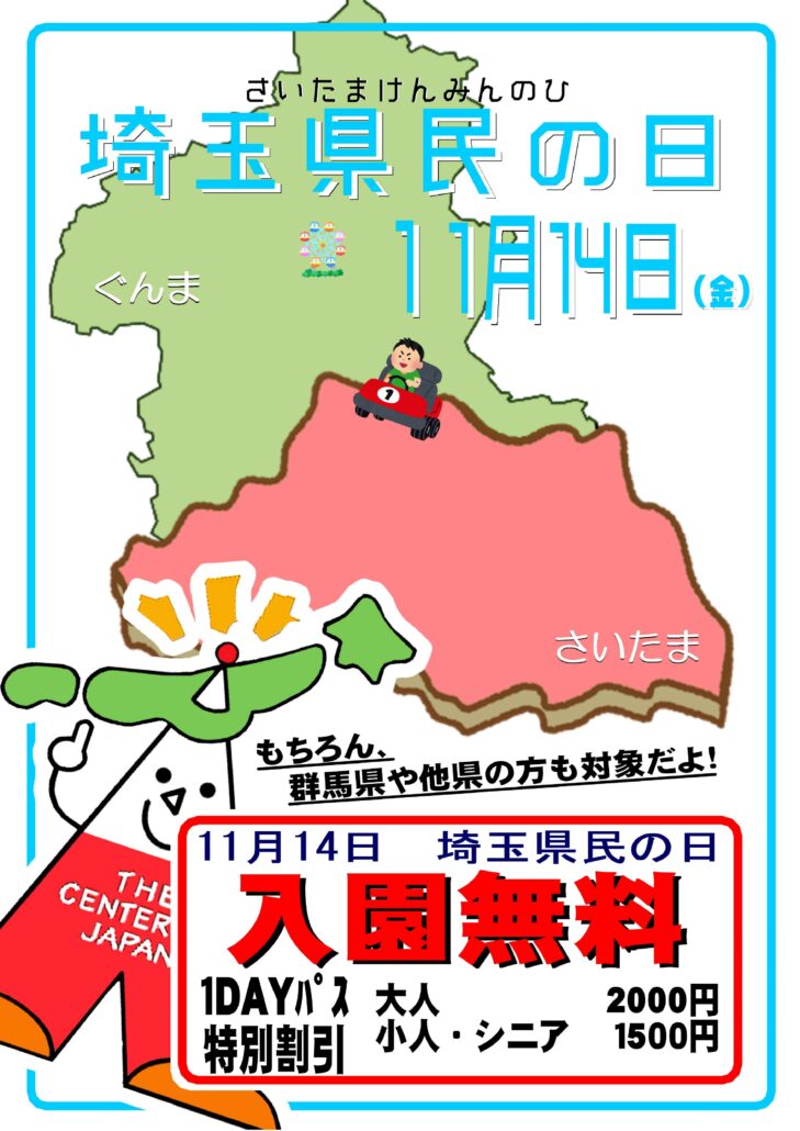 お知らせ・イベント HOMEお知らせ・イベント11月14日(金)埼玉県民の日は1デイパス特別割引を実施します 2024.11.10 11月14日(金)埼玉県民の日は1デイパス特別割引を実施します 埼玉県民の日を記念して、11月14日(金)に限り、1DAYパスを冬期料金から更に100円引!! (埼玉県民ではない方も対象となります。) 【1DAYパス料金】 おとな(高校生以上) 2,100円→2,000円 こども(3歳以上)・シニア(60歳以上) 1,600円→1,500円 ※冬期営業期間中のため、入園料は無料となります。 ※その他、各種割引がご利用いただけません。ご了承ください。 次の記事 一覧に戻る