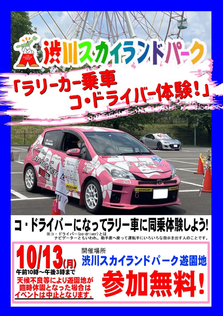 お知らせ・イベント HOMEお知らせ・イベント10月13日(月祝)ラリーカー乗車体験イベントを開催します 2025.10.05 10月13日(月祝)ラリーカー乗車体験イベントを開催します ラリーカー乗車 コ・ドライバー体験 開催日時 2025年10月13日(月祝)10:00~15:00 場所 渋川スカイランドパーク 第4駐車場 参加料 無料(別途入園料が必要となります。) ※ 天候等により予告なく変更になる場合があります。 ※ 天候不良等により遊園地が臨時休園となった場合はイベントは中止となります。 前の記事 一覧に戻る